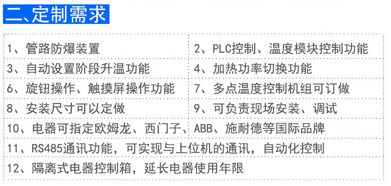 管道辅助电加热器特点: 1、管道辅助电加热器采用了不锈钢筒体,体积小、占地少、移动方便,在不锈钢内胆和不锈钢外壳之间采用了加厚保温层,失温程度低,保持温度,节省电能。 2、加热元件(不锈钢电加热管)的主要零部件采用了进口材料,加工过程也使用了先进的生产设备和工艺,配合不同电压,发挥高性能。 3、介质流向性设计合理,加热均匀,无高、低温死角,热效率高。 4、管道加热器安装了国内知名品牌的温控器,用户可以自由设置温度。全部配置过热保护器,用来控制温度和缺水超温保护,避免加热元件及系统的损坏。 管道辅助电加热器结构型式: 管道辅助电加热器分为卧式和立式,工作原理一样。 1、立式管道加热器占地面积小但对高度有要求,卧式占地面积大但高度没要求。 2、立式、卧式管道加热器材质有:碳钢、不锈钢SUS304、不锈钢SUS316L、不锈钢310S等。根据加热不同的工艺要求选用合适的材料。 3、管道加热器采用法兰式电加管加热,并配有专业设计导流板,保证电热管发热均匀及加热介质充分吸收热量。 4、温度要求的(出气口温度大于600度),采用不锈钢310S电辐射加热管加热,出气口温度可达800℃。 管道辅助电加热器应用: 广泛的应用到航空航天、兵器工业、化工工业和高等院校等许多科研生产试验室。特别适合于自动控温和大流量联合系统和附件试验。